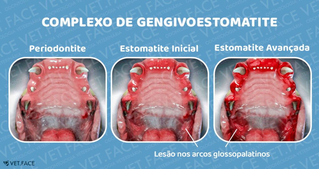 Então, chamamos esse processo de Complexo Gengivite Estomatite Faringite, porque exatamente essa região da faringe toda fica ulcerada como pode perceber nas fotos de estomatite em gatos acima. Isso vai descendo também para a região da faringe.
